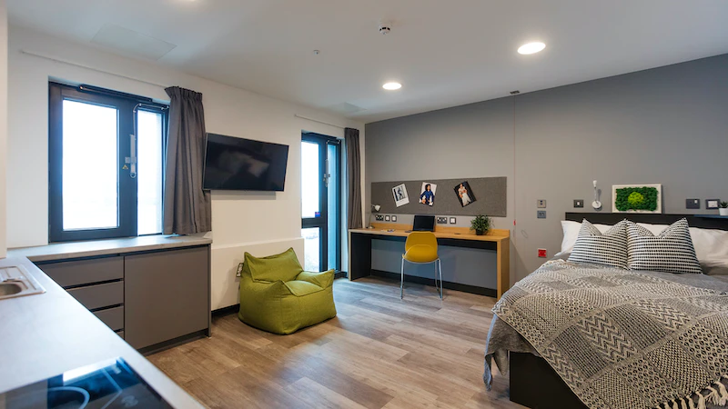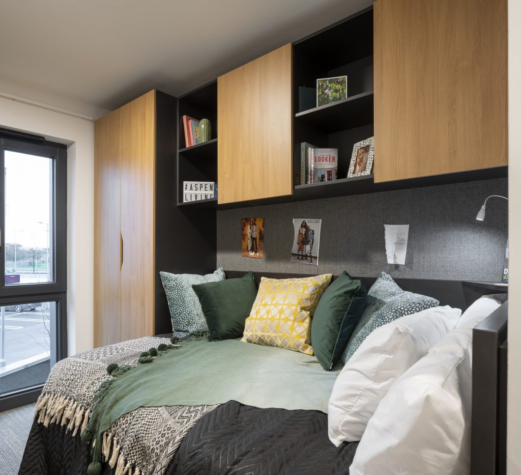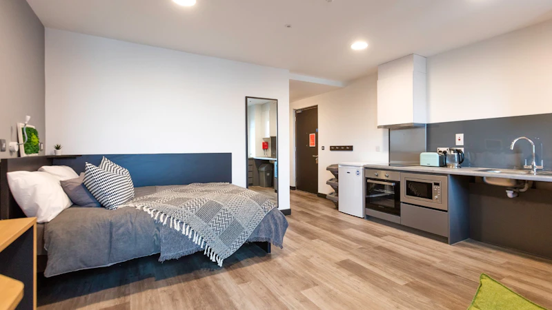 Fancy your own space? Our cosy studio is the answer! Available on a flexible tenancy, pick your own arrival date that works best for you. Sink into your comfy bed after a long day at uni and enjoy plenty of space with a wardrobe, bookcases, cupboards, and your very own study desk with a chair! The accommodation is all inclusive of bills with fast WiFi, perfect for streaming or cracking on with uni work. Cook up a delicious meal in your own kitchenette and mix with your new friends in the fabulous Aspen communal spaces! All of our studios are DAC compliant.