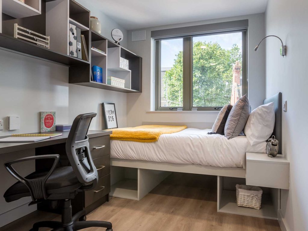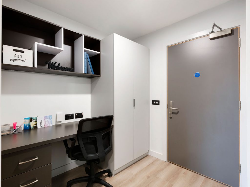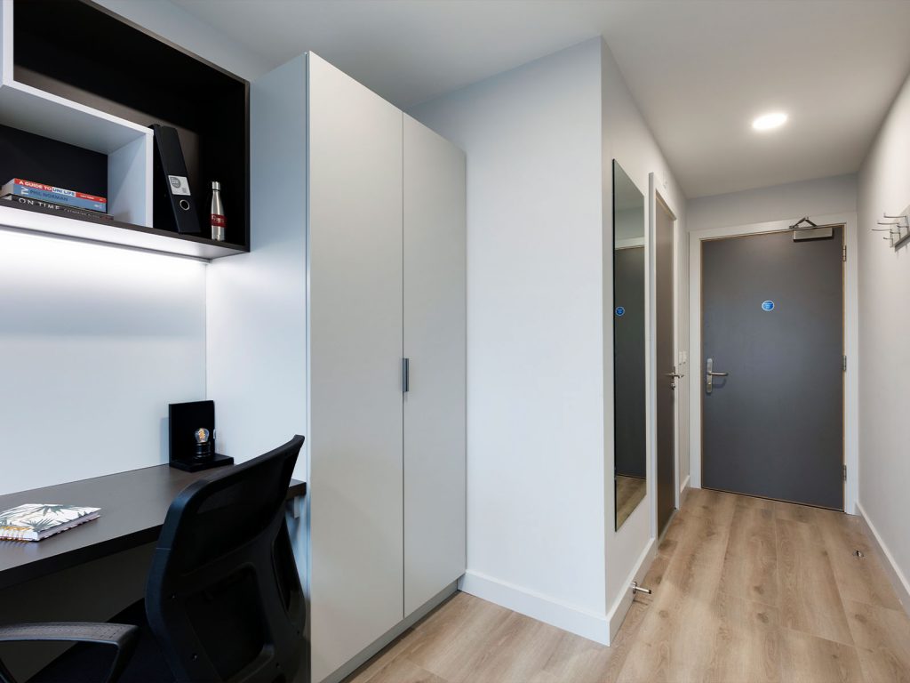Fully furnished bedroom to include wardrobe, shelving and smart storage, double blackout blinds, study desk with light, with integrated magnetic whiteboard, adjustable desk chair, USB ports, personal thermostat, adjustable lighting by the bed, coat hook and full-length mirror.