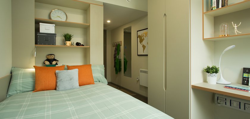 Securing a silver plus room means your apartment will have 4 or 5 other rooms on an upper floor. You’ll get so close with your housemates that chilling on the sofa watching TV, listening to music or having a group dinner will become the norm. These apartments are kitted out with all the necessary mod cons including dishwasher, kettle, toaster and fridge freezer in the spacious communal lounge area. Your room is designed to ensure that you get a great night’s sleep with the inclusion of black out blinds and a super comfy mattress. Studying is made easy whether your right-handed or left-handed as our desks are designed to suit both perfectly. *Rates are inclusive of high speed internet access and water , gas and electricity are charged separately at €25 per week.