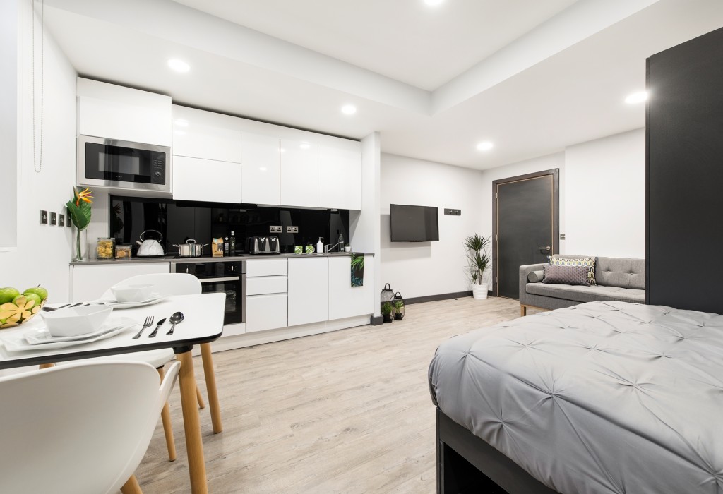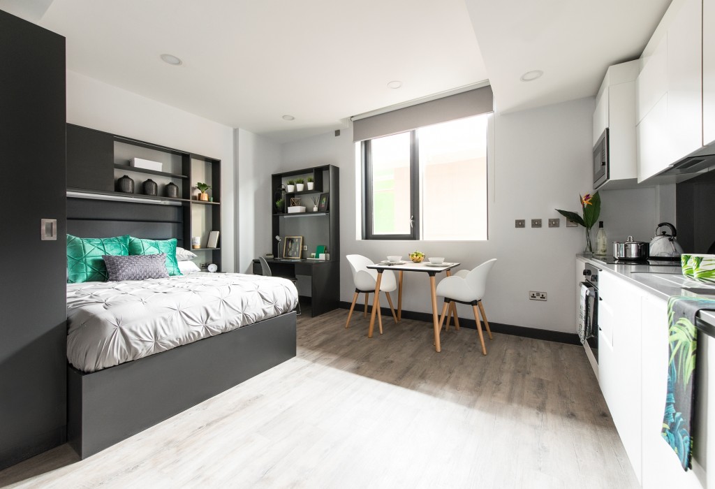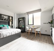 The Classic Studio is a self-contained and fully furnished studio apartment. Each studio is fully furnished to include: 4ft 6 double bed and mattress, study desk with integrated magnetic whiteboard and study chair, wardrobe, shelving and integrated storage spaces including additional built-in storage under each bed, coat hook, mirror, USB ports and adjustable lighting by the bed, plus a flat screen smart TV. The kitchen area is equipped with ceramic hob, oven, dishwasher, microwave, fridge/freezer and dining area. Each studio has its own modern en-suite bathroom with shower, washbasin, demister mirror, towel rail and WC. A delightful, spacious area with floor to ceiling glazing providing lots of natural daylight.