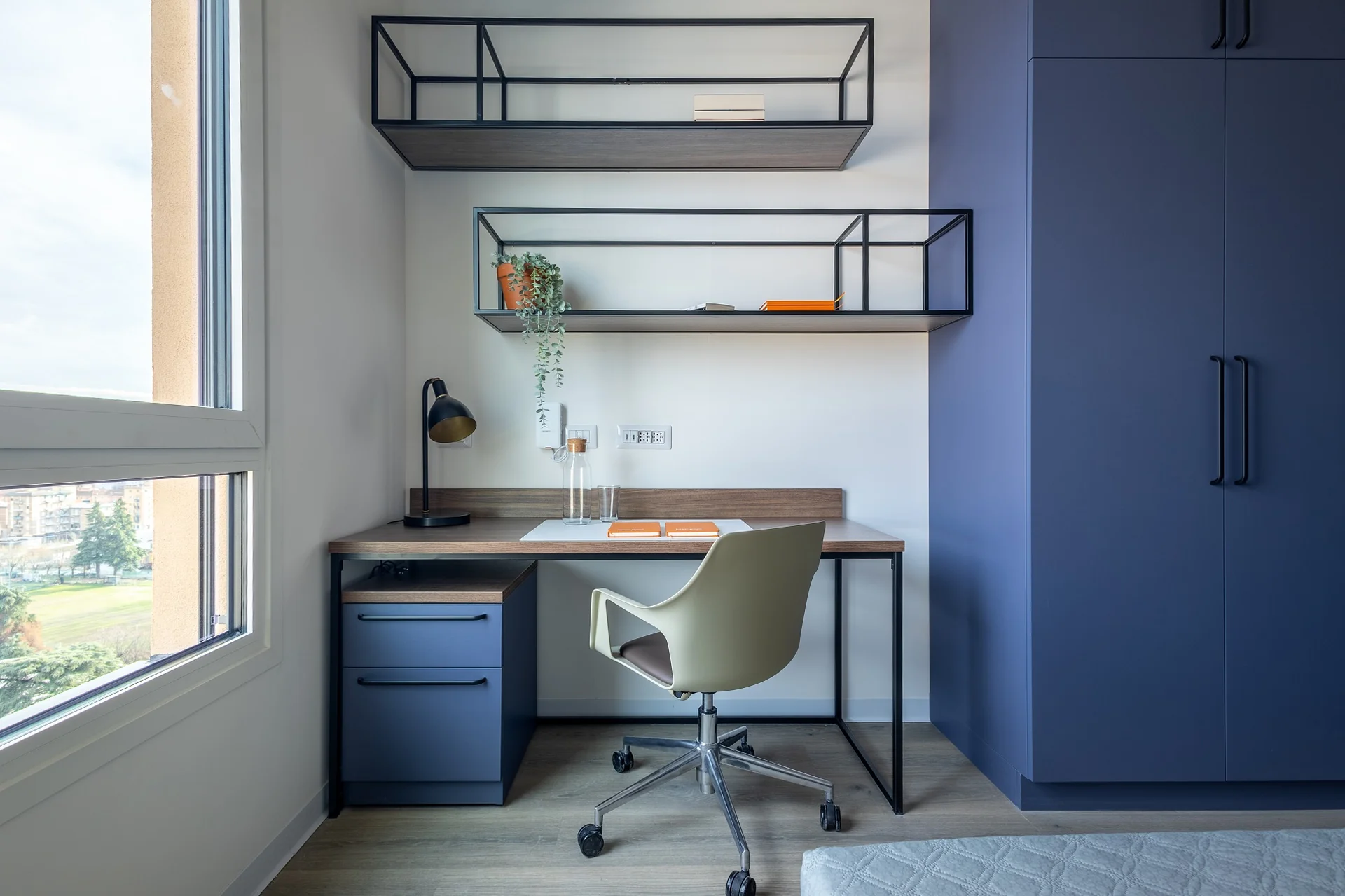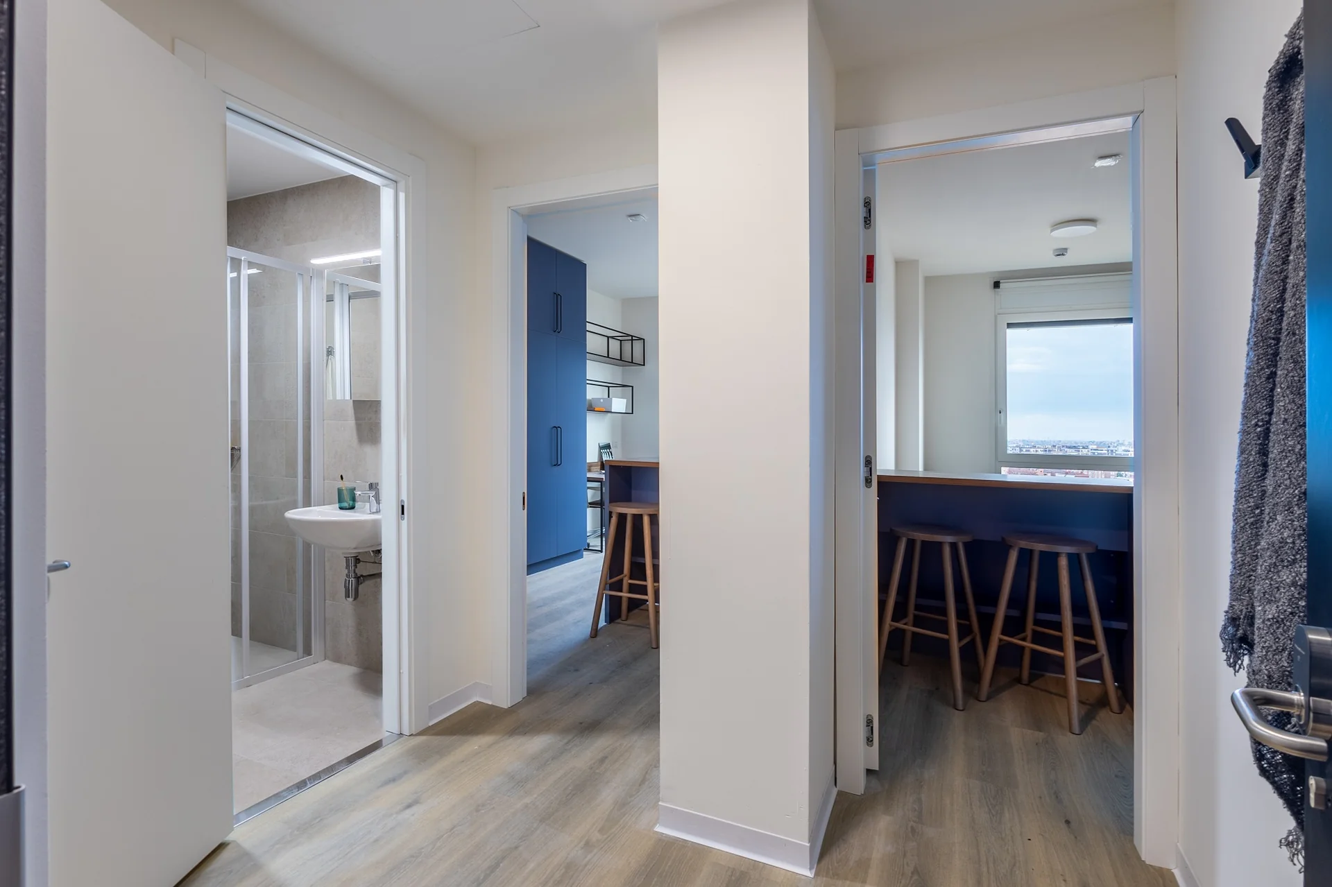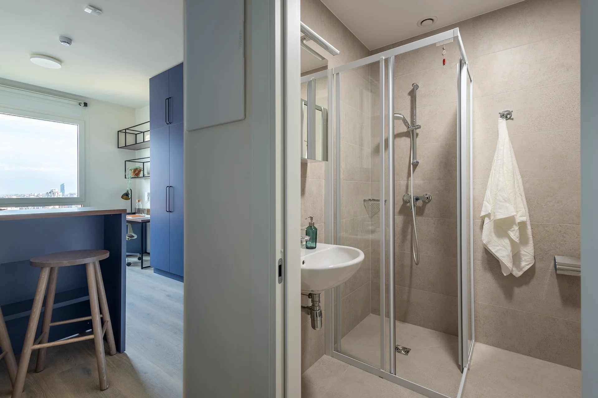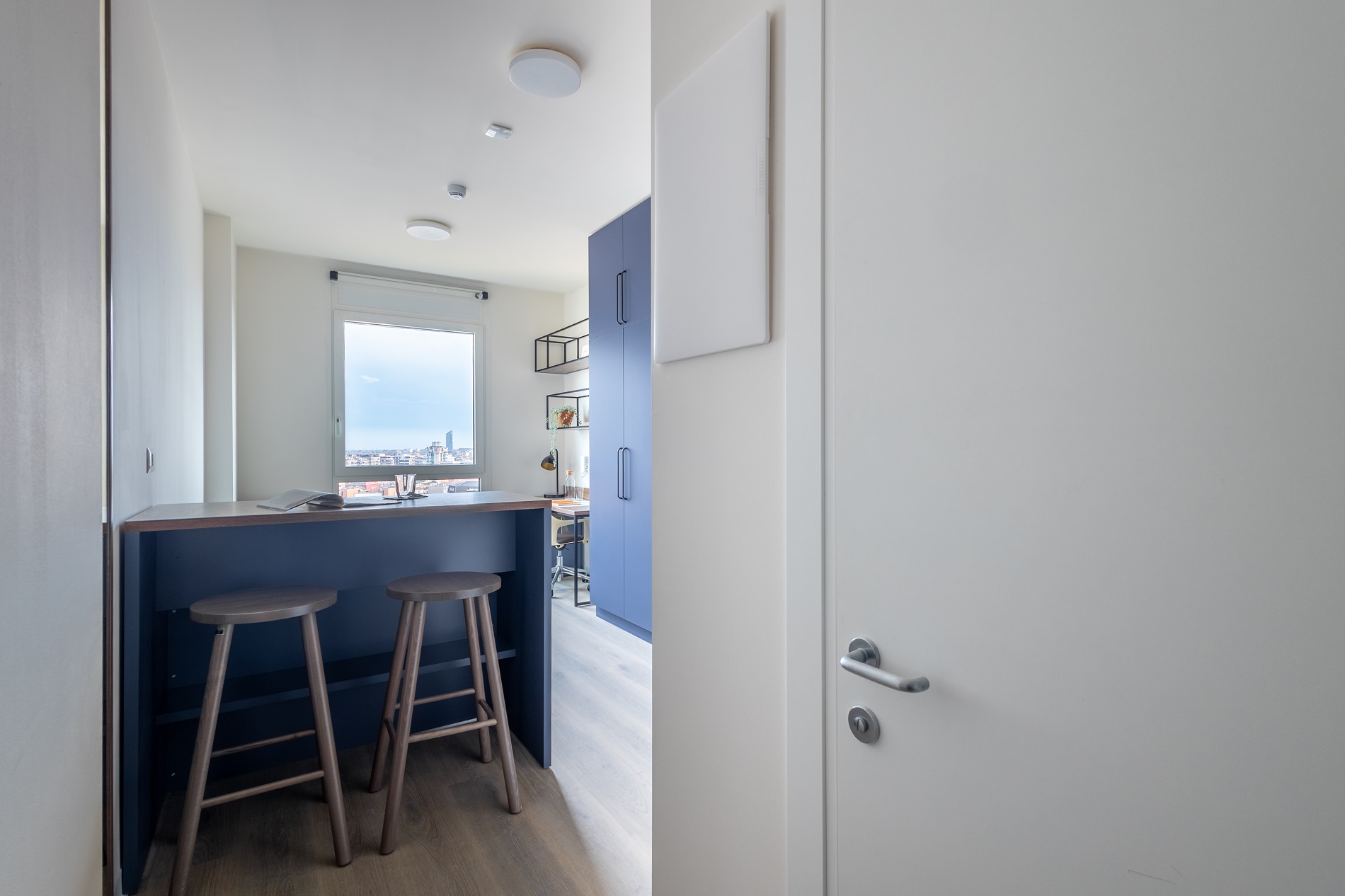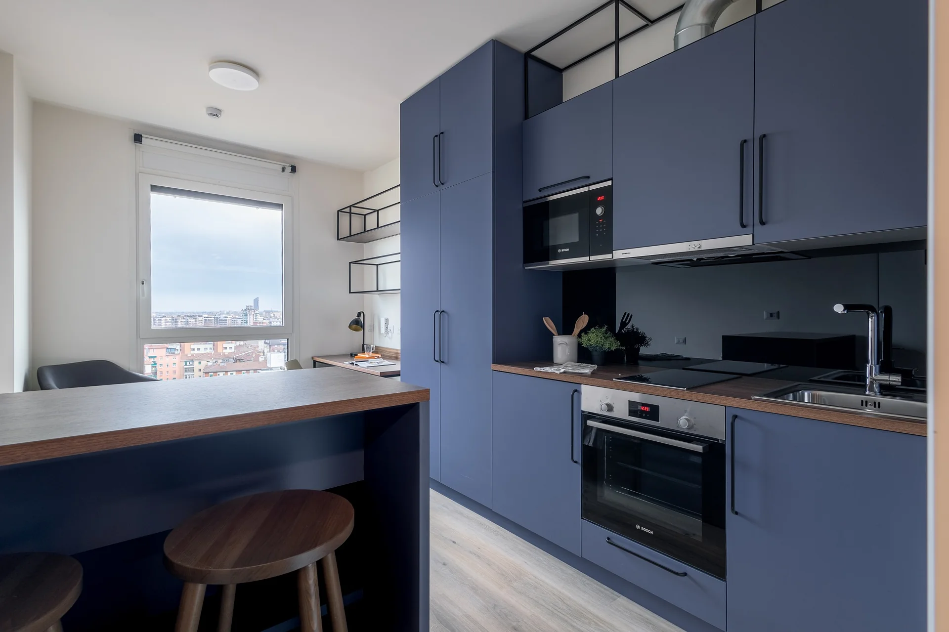 Laude Living is a student housing in Bologna providing students with studio accommodation near their respective universities. All studios include a private en-suite bathroom with a shower, a 120 cm bed, a desk with a chair and a study lamp, a wardrobe, and a dining table with two chairs. Studios come with their own private kitchen, which is equipped with a sink, an induction hob, an electric oven, a microwave, a refrigerator, and cabinets/cupboards for dishes. Twodios are also available with two rooms instead of one in case you want to share a living with a friend