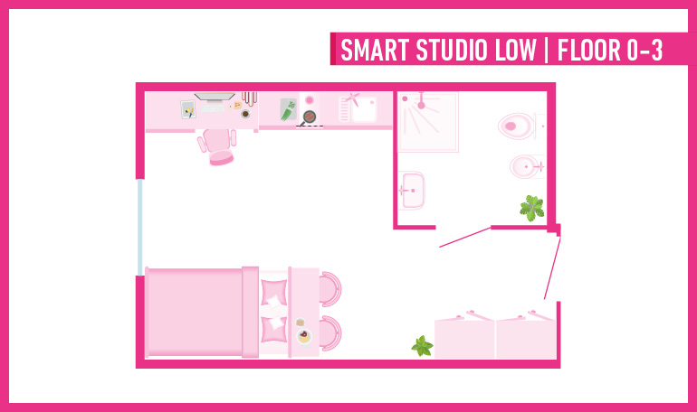 A 15m² - 19m² self-contained studio features a small double bed, wardrobe, workspace, heating and cooling, en-suite bathroom, private lounge, and private kitchen with sink, induction hob, electric and microwave oven, refrigerator, cabinets/cupboards for dishes.