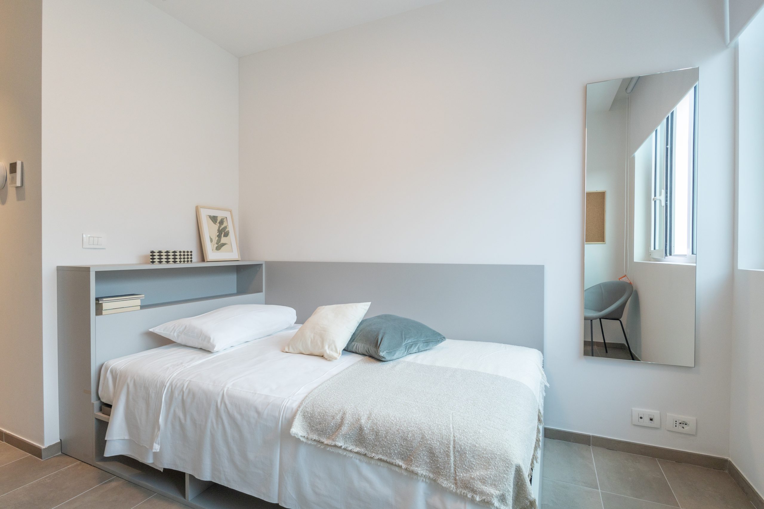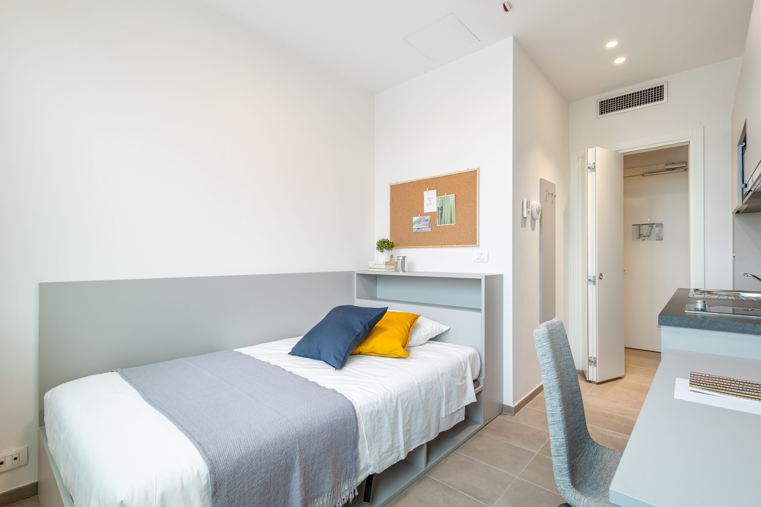 Florentia Living Firenze is a Florence student accommodation that offers a diverse range of studio options. Studios at Florentia Living Firenze offer everything you need in their self-contained studios, which include a bed, a comfortable study area with a desk, chair, and shelves, a wardrobe, a kitchen that would fulfil all of your cooking needs, and bathrooms with showers, as well as centralised heating and cooling. Kitchens typically have sinks, stoves, electric microwave ovens, a fridge, and storage places for your plates. Room types differ in size and slightly vary, such as an additional dining area, a larger bed, or even extra features.