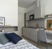 A 16 m² self-contained studio featuring a comfy bed, wardrobe, workspace, heating and cooling, en-suite bathroom, private lounge, and private kitchen with a sink, induction hob, electric and microwave oven, and refrigerator.