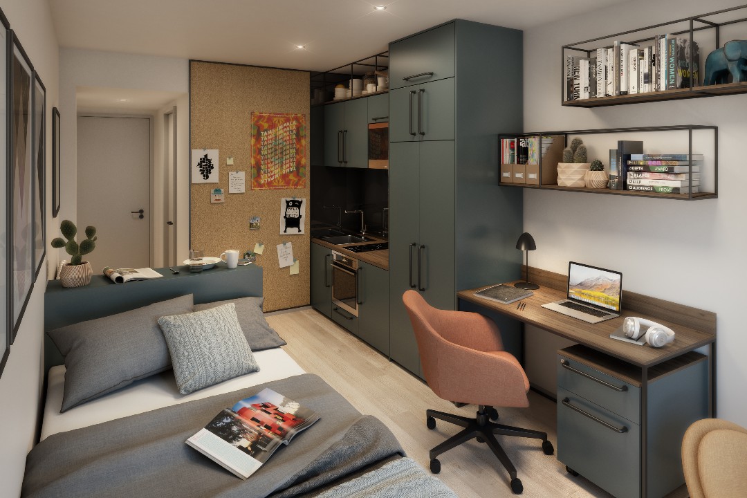 A self-contained studio features a bed, wardrobe, study desk, chair, en-suite bathroom, a kitchenette with sink, induction hob, electrical and microwave oven, refrigerator, and cabinets/cupboards for dishes.