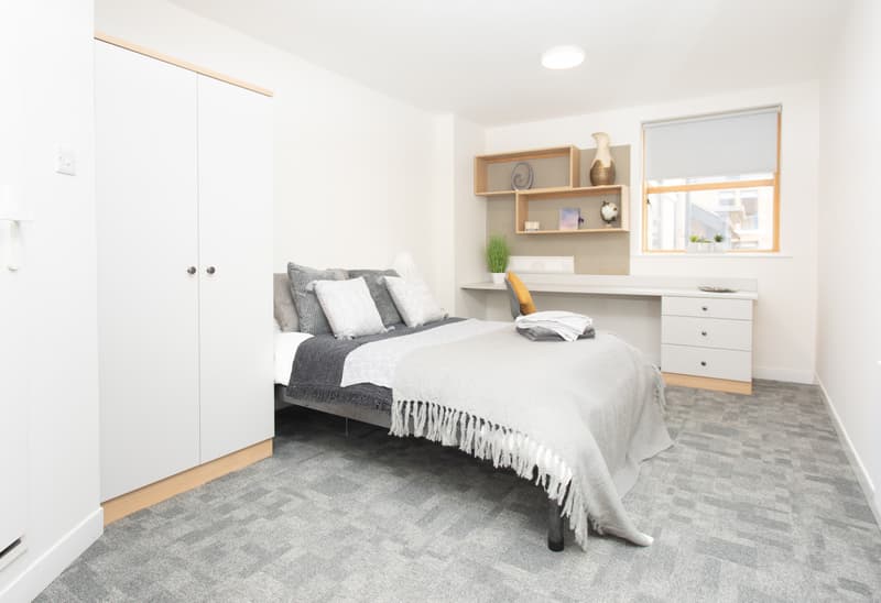 The Deluxe Ensuite Room offers a larger than average living space, between 16-21m2, with a double bed, ensuite bathroom, large study area with shelving above and plenty of room to hang out with your mates. The shared areas in the flat include a modern kitchen/lounge with smart TV.