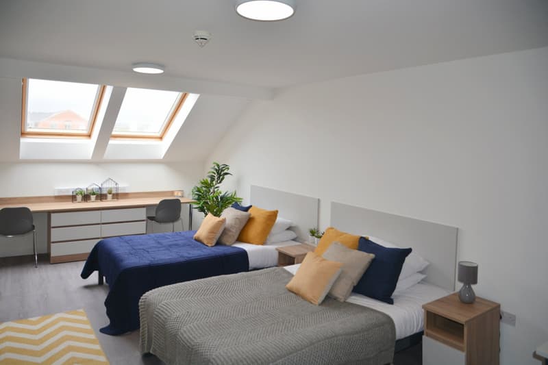 Twin Studio on the 5th floor for students wanting to share with a friend! With 2 x 3/4 beds in a shared 30m2 room, 2 x study desks, your own bathroom and fully equipped kitchenette, the Twin Studio is a great choice for students who want to share a generously sized studio. *Room layout is for illustration purposes only and may vary in layout dependent on location within the building*