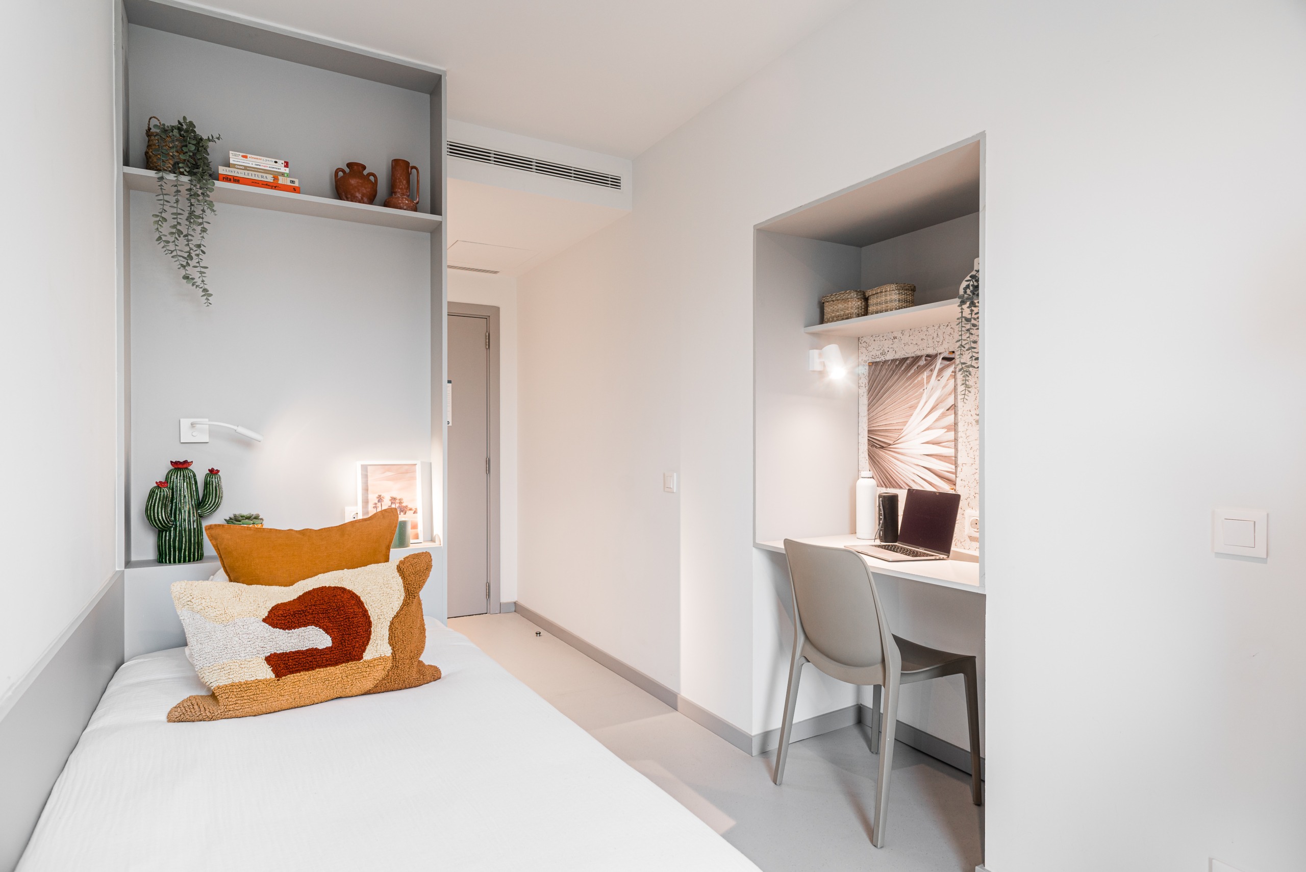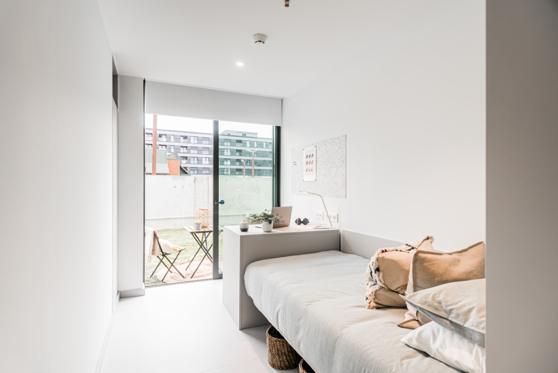 Our Deluxe studios are designed for individual occupancy, measure 14.5m², and are located on the ground floor. Each studio/apartment includes a single bed, a study desk and chair, a wardrobe with shelves, a private bathroom, a kitchenette, and a spacious balcony.