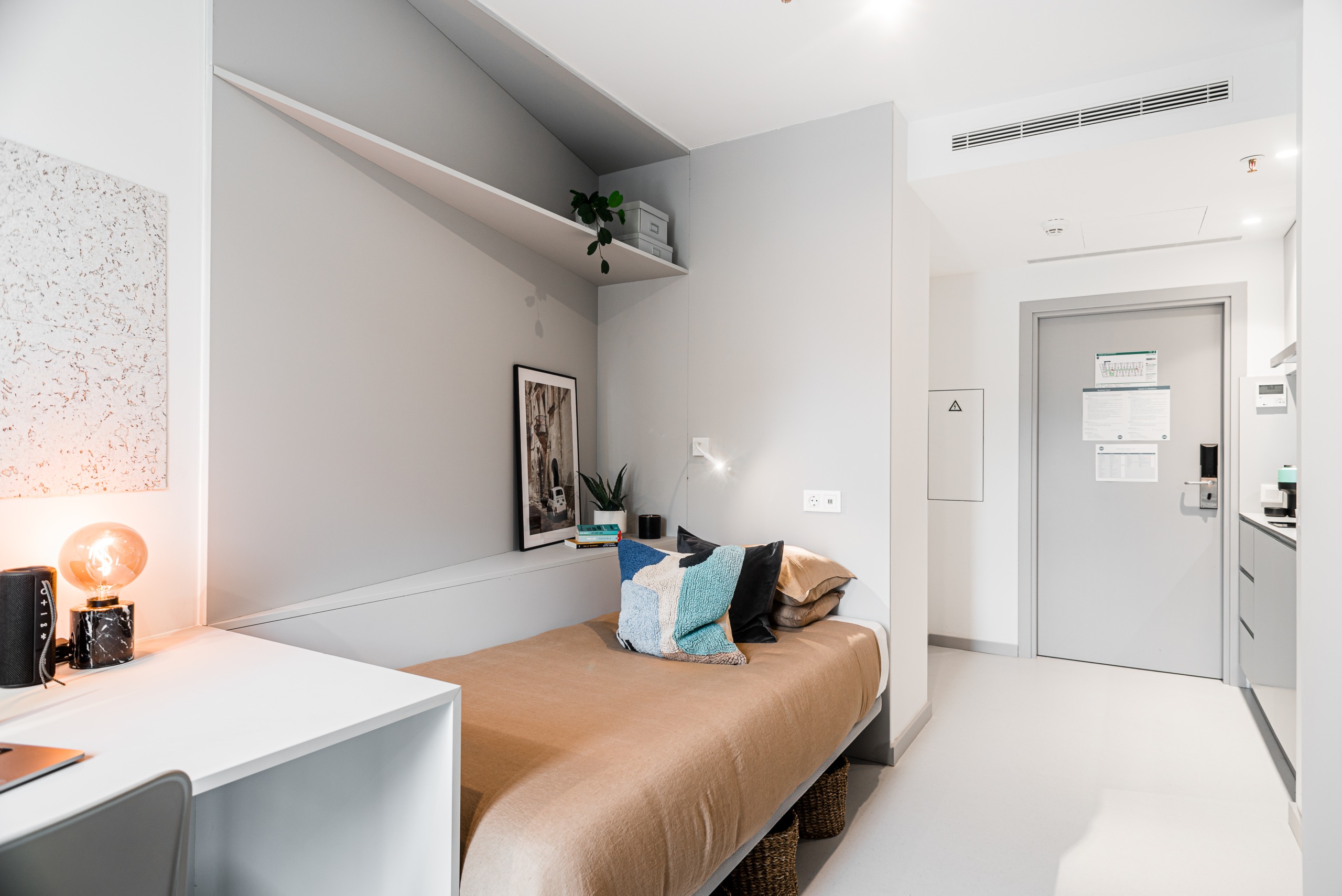 Our Classic Studios are designed for single occupancy, 14.5m2 size and located on the second and third floors. Each studio apartment comes with a single bed, study desk & chair, wardrobe with shelving, ensuite bathroom and a kitchenette.