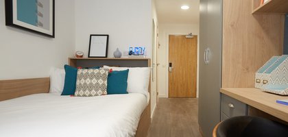 The same great features as the Silver - with a small double bed and en suite shower room, plus lots of storage space. Access to a shared kitchen/living room where you can socialize with your new flatmates. Average room 20.3sqm.