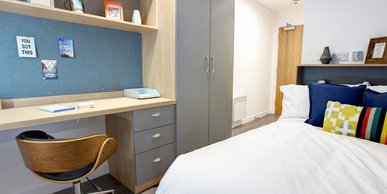 Our fantastic Bronze rooms come with everything you need to love your uni years, including a small double bed, your own en-suite shower room, study area, and ample storage. Then you also have access to the shared kitchen/living room. Located on the First Floor.