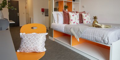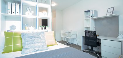 This luxury and modern studio located on the ground floor measures around 22m2 and comes with a double bed, study area, fully fitted kitchenette, an ensuite bathroom and ample storage. The shared areas include a study room and games room. You will also have access to the onsite cinema room, onsite laundry facilities.