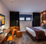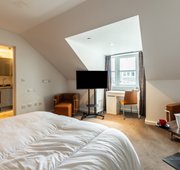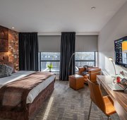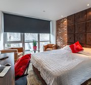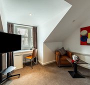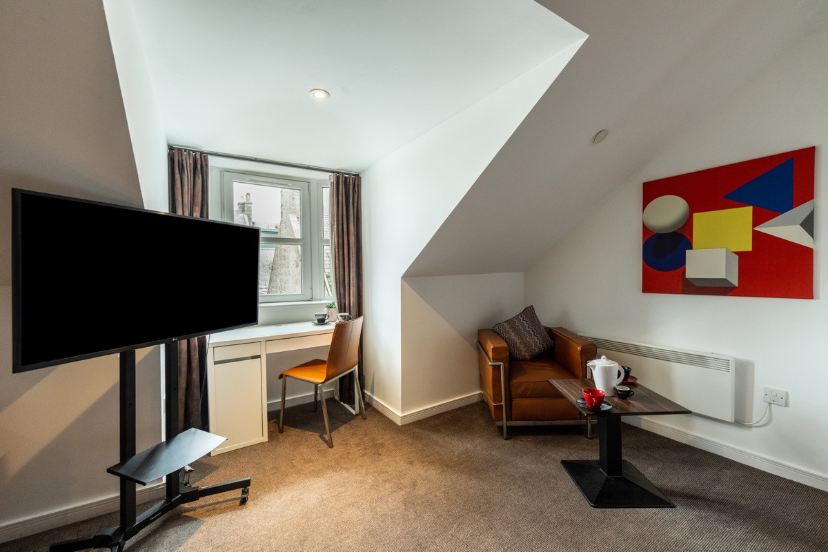 With rooftop views over Aberdeen and with the luxury of twin showers, the Kadinsky is one of only a handful of our extremely spacious private suites. The Kadinsky Suite is very well laid-out. The bedroom has a king-size bed, large double wardrobe and relaxed seating area. The study area, with desk and chair, is located under the room's window - an ideal place to study thanks to views of the city's skyline. The separate kitchenette is located between the main room and the bathroom, and comes with hob, oven and integrated fridge with freezer compartment. The premium, en-suite bathroom can be found off the kitchenette and as well as a separate bath and twin shower, benefits from a large original window which lets in an abundance of natural daylight. The Kadinsky Suite is located on the first floor of Langstane Place.