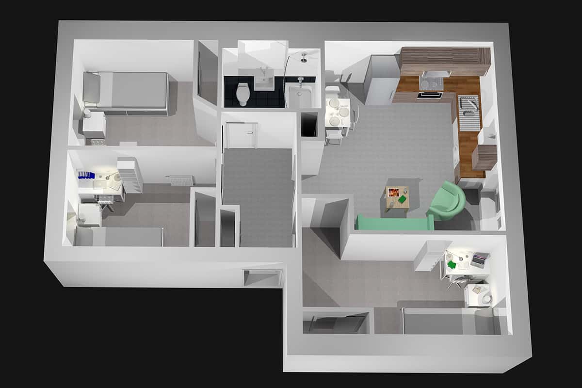 This 2 bed study has a bright bedroom with ¾ sized beds with great under bed storage. Each room comes with a mirrored wardrobe, shelving unit, desk with drawers and has large windows which bring in a lot of natural light. It is also benefits from a shared spacious bathroom with a WC, large bath with overhead shower, sink and accessories.