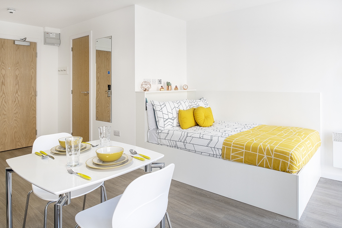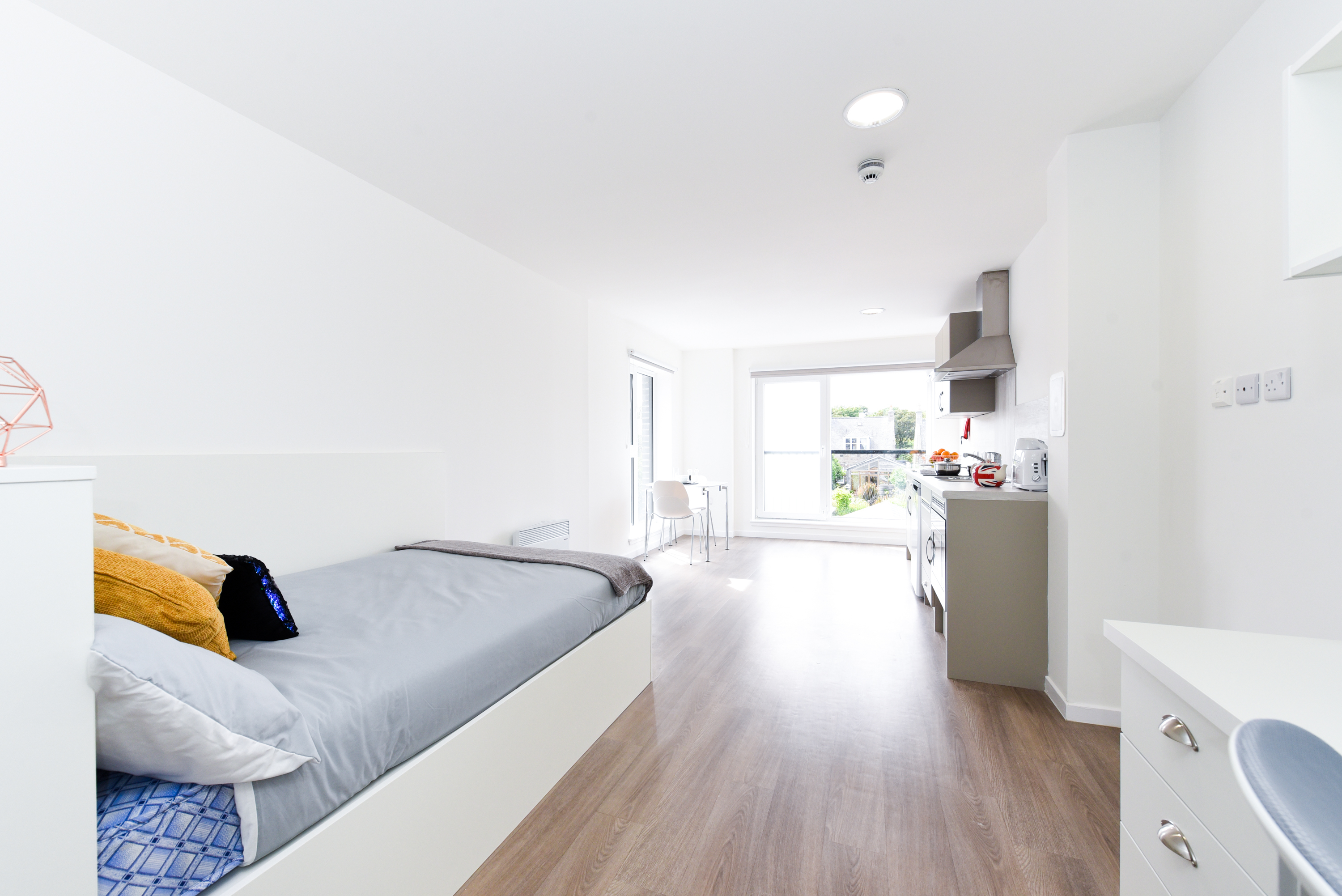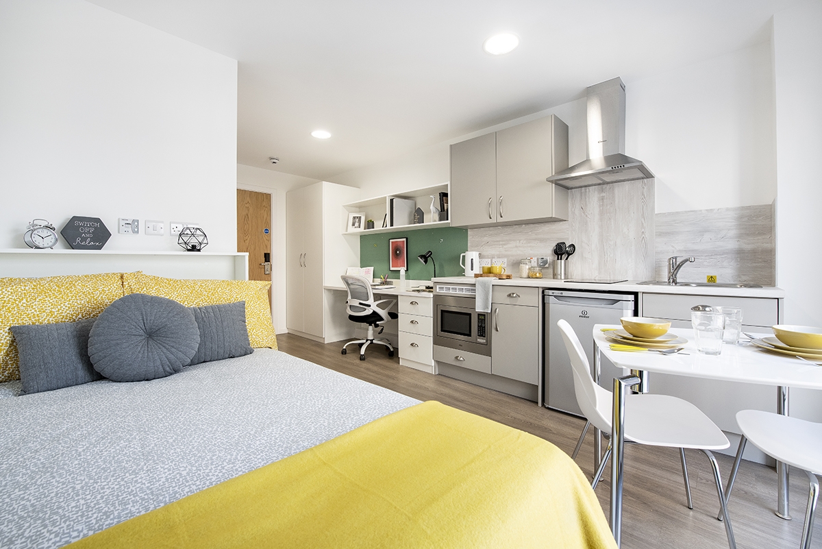 Self-contained bedroom, kitchen and bathroom Approximately 17.29 - 38.46m² Small double bed Desk, chair, wardrobe and chest of drawers included in your room