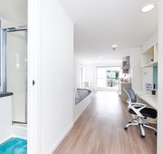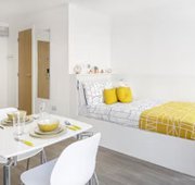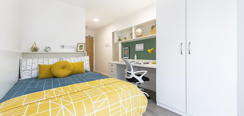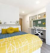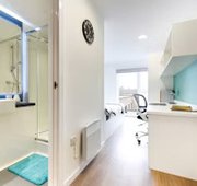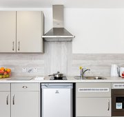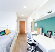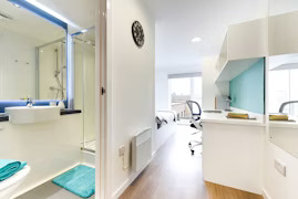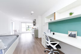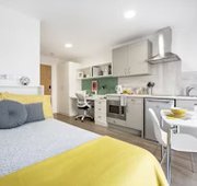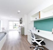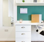 Self-contained bedroom, kitchen and wetroom. Lowered counters and desk. Approximately 17.29 - 38.46m² Small double bed Desk, chair, wardrobe and chest of drawers included in your room