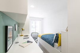 Communal kitchen and living space with 4-9 en-suite rooms per flat Approximately 10.2-10.8m² Small double bed Under-bed storage, desk, chair, wardrobe and chest of drawers included in the room