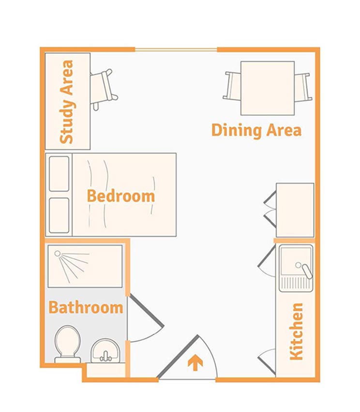 Our standard studios offer a bright and airy atmosphere, boasting two expansive windows that frame the picturesque views of Aberdeen. With ample space, each studio is equipped with a desk featuring three drawers, a notice pin board, and a wardrobe, ensuring you feel right at home from the start. Prepare delicious meals in the modern kitchenette, complete with a combi-oven, kettle, toaster, and dining table. Being one of our smaller studios, this is perfect for students who want their own kitchen while maintaining their privacy.