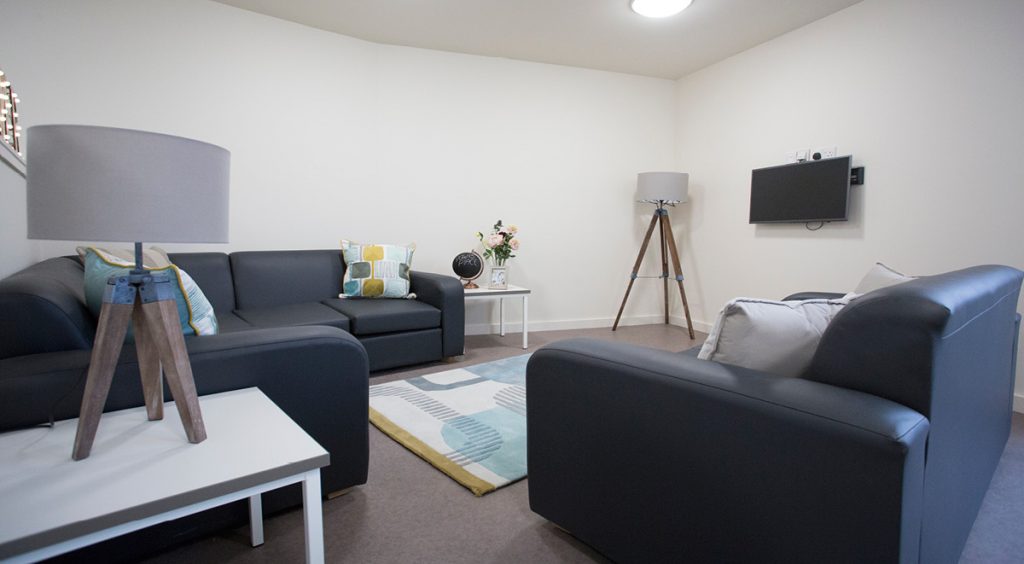 Our 2 Bed Apartment features two en-suite bedrooms that measure 13m² and feature a 3/4 bed that has ample space underneath for storage. The room also includes a desk with 3 drawers, a notice pin board, desk chair and wardrobe. The shared area includes a kitchen with an oven, microwave, kettle, toaster and dining table, as well as a communal lounge with sofas and a TV.