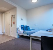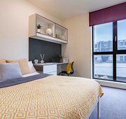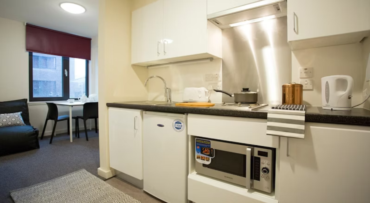 Our self-contained premium studio apartment measures 20m² and features a 3/4 bed that has ample space underneath for storage. It has two large windows that allow a superior view of the city. The room also includes a desk with 3 drawers, a notice pin board, desk chair and wardrobe. Each studio has its own personal kitchenette with a combi-oven, kettle and toaster, as well as a dining table with two chairs. A stylish communal area is also available that features a pool table, study benches and a smart TV.