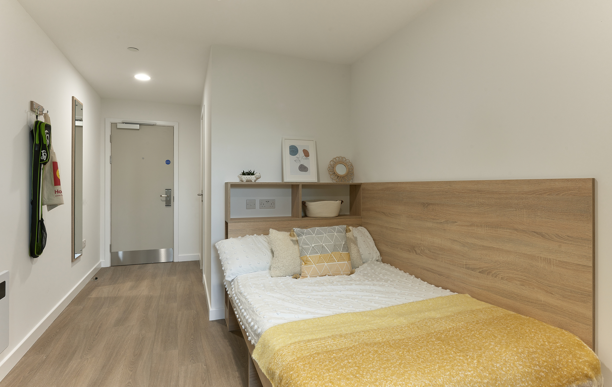 Room size From 16m² Bed 3/4 double bed Heating Electric heater Storage Wardrobe Storage Bedside shelf Storage Drawers, underbed storage & coat hooks Studying Desk & chair Studying Bookshelf & noticeboard