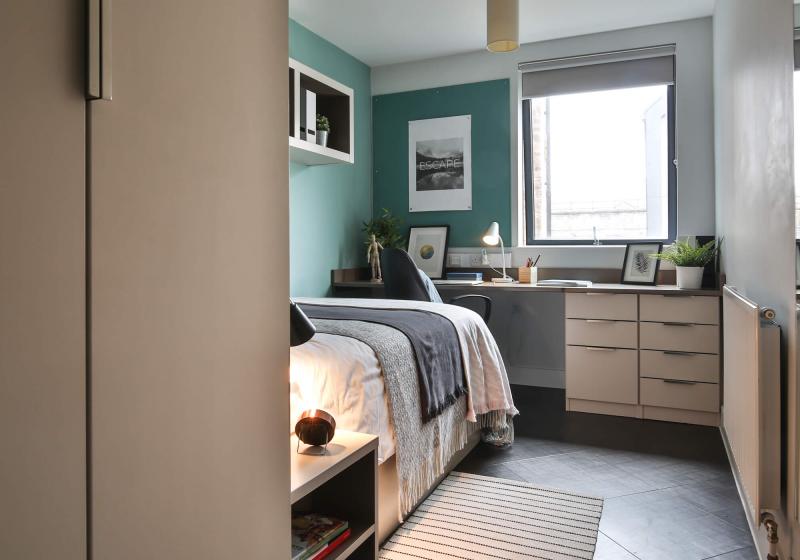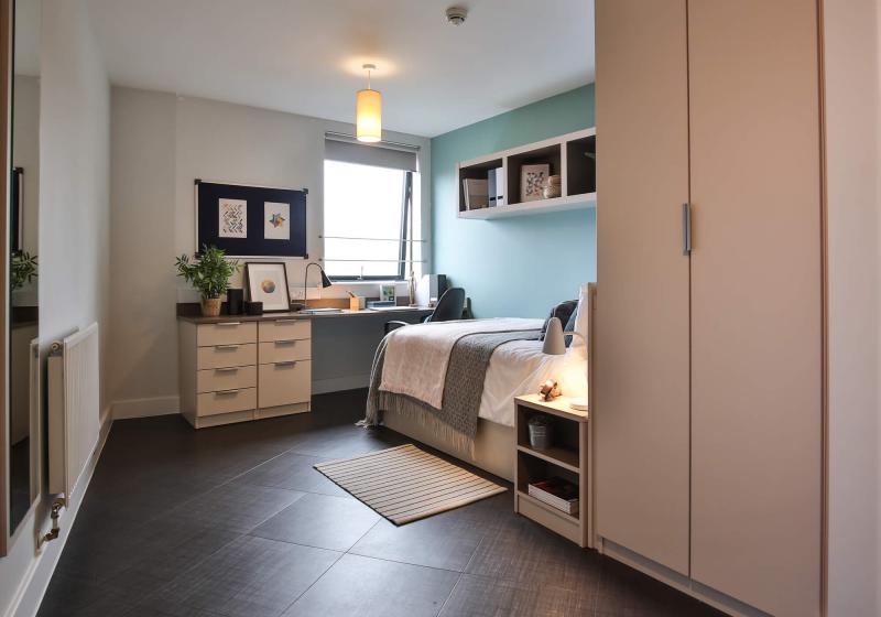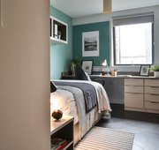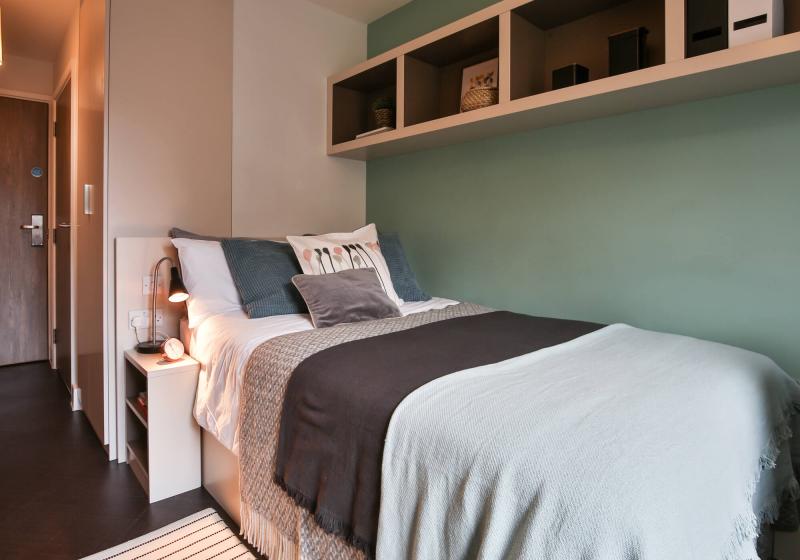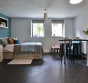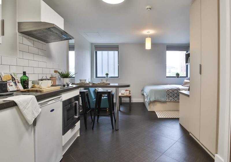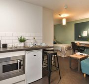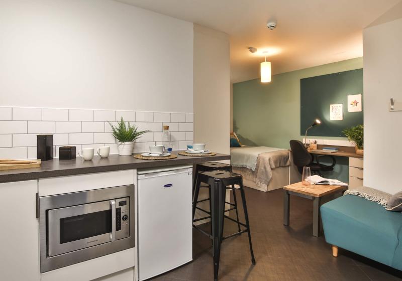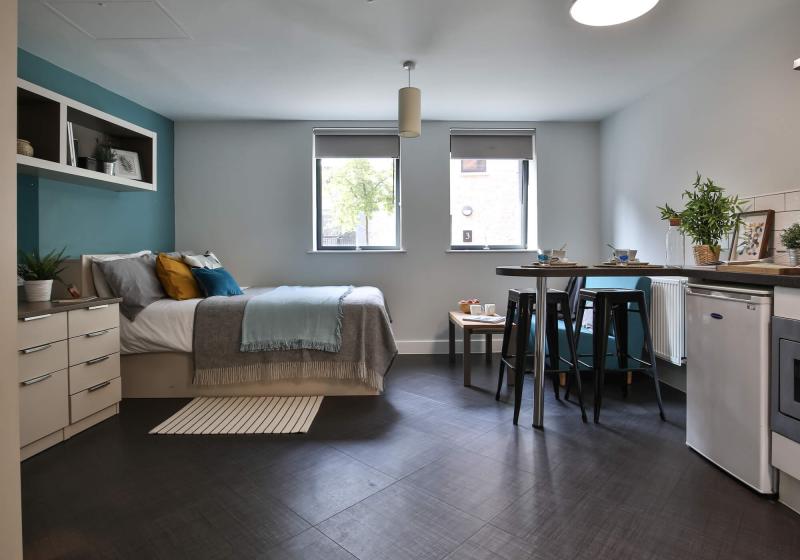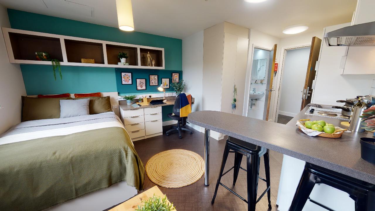 If you’re looking for even more space, these 22-24 sq m self-contained Platinum Studios are larger than the majority of our rooms available and come with the same great features as our Bronze, Silver and Gold Studios. Giving you more space to relax, study, cook and entertain, these spacious rooms come with a small double bed, study area, seating and en suite shower room. You have your own kitchen and dining area so that you get the most privacy possible.