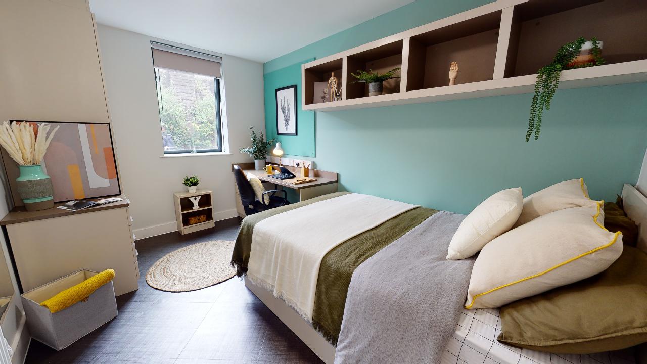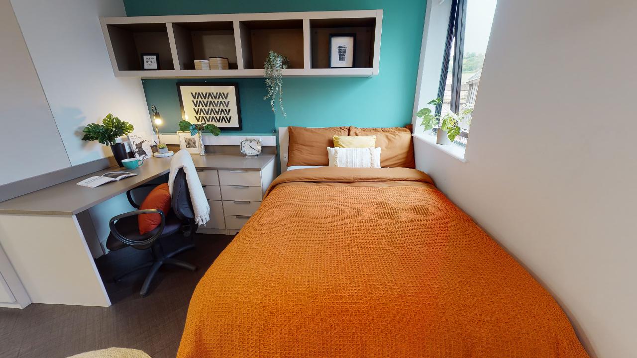 The largest room available at Twerton Mill with a total of 26-28 sq m and offering the same great features as our Platinum Studio but with adapted facilities and situated on the ground floor. On the ground floor, our Platinum Studio Plus has wheelchair access and adapted facilities, a small double bed, study area, seating and en suite shower room. The building also features a great social space and a games room.