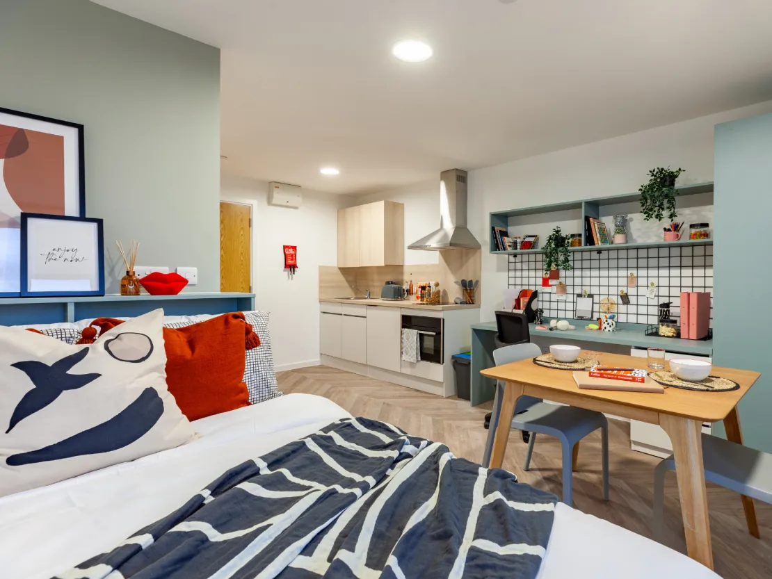Discover comfort in our studio with a double bed, study area, kitchenette and dining space. Enjoy your very own TV, under bed storage and a self contained kitchen and living area. Approximately 20 sqm. Plus you can share with one other person at no extra cost!