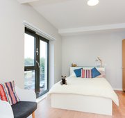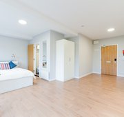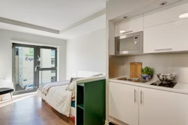 Room size 20.3m² 3/4 (small double) bed Desk, chair and wardrobe provided in room Ensuite bathroom with shower, toilet and basin Self-contained kitchen, bathroom and living space
