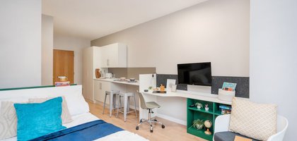 Self-contained kitchen, bathroom, and living space Double bed Desk, chair, and wardrobe included in the room