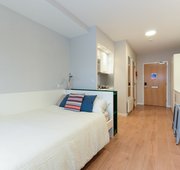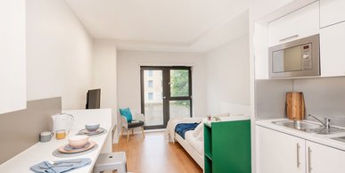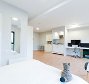 Self-contained kitchen, bathroom and living space on a high floor Approximately 21 to 22m² Double bed Desk, chair and wardrobe included in the room