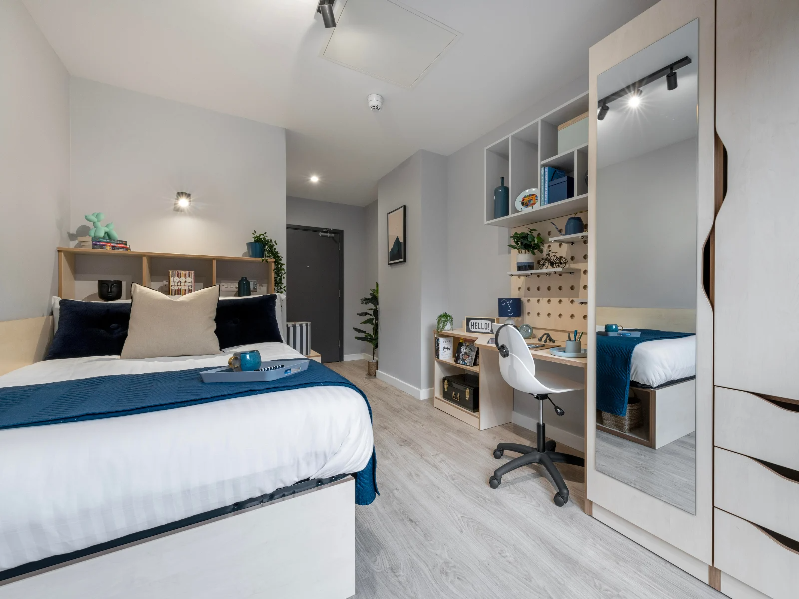 A step up in space with the same social energy. Enjoy a larger room, small double bed, modern en suite, ample storage, and spacious desk perfect for study and chill. Room size: 14.2 - 16.8 sqm