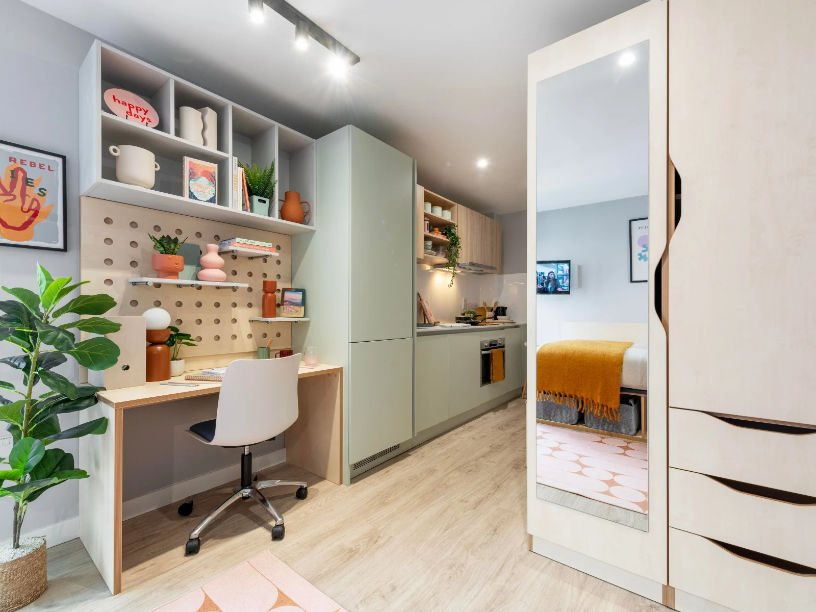 Our most spacious studio, designed with accessibility in mind and all the premium features: fully fitted kitchen, washer/dryer, TV, loads of storage, en suite and more. Room size: 24.87 - 28.09 sqm.
