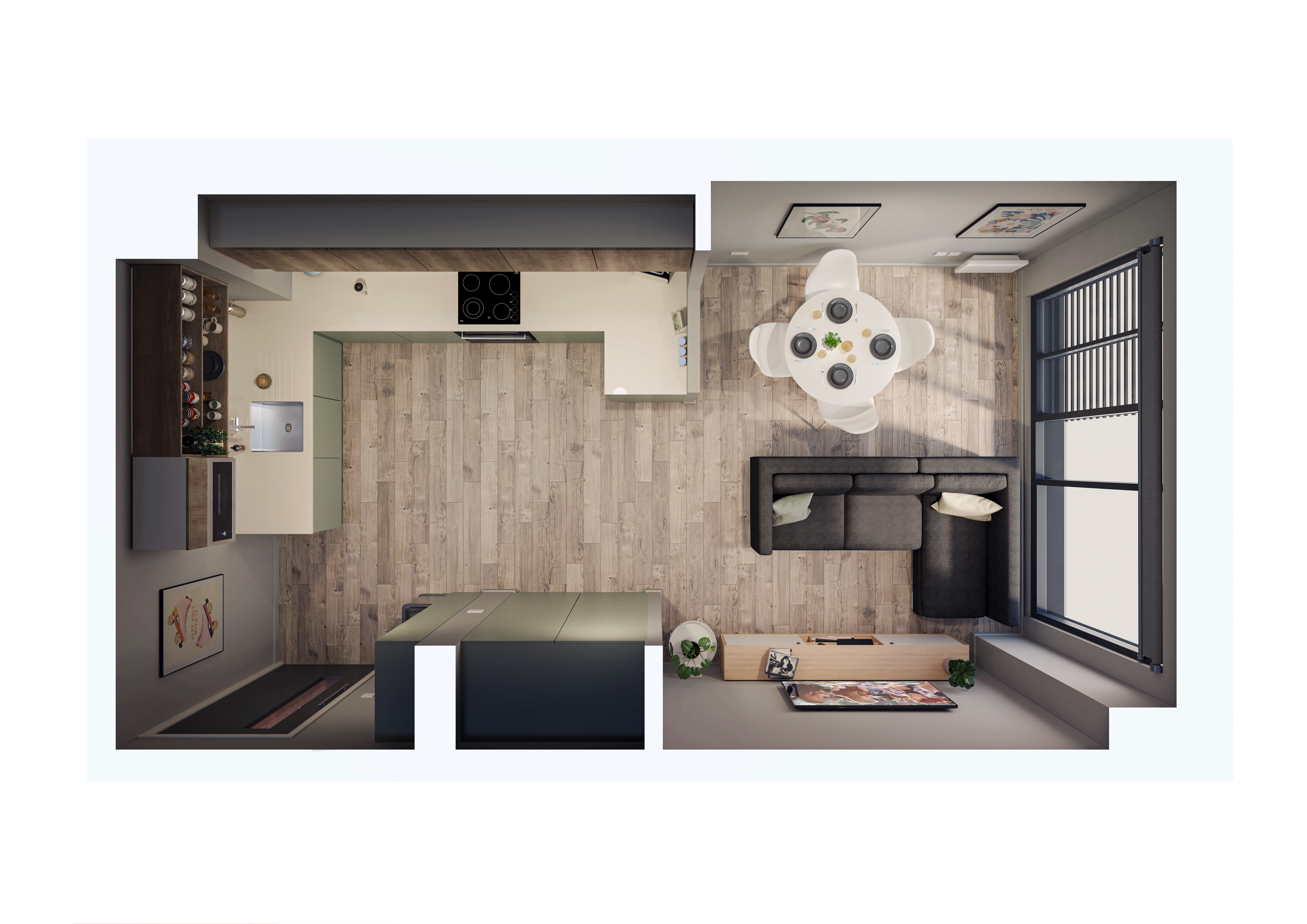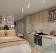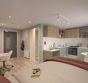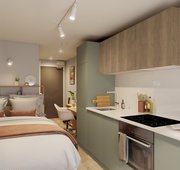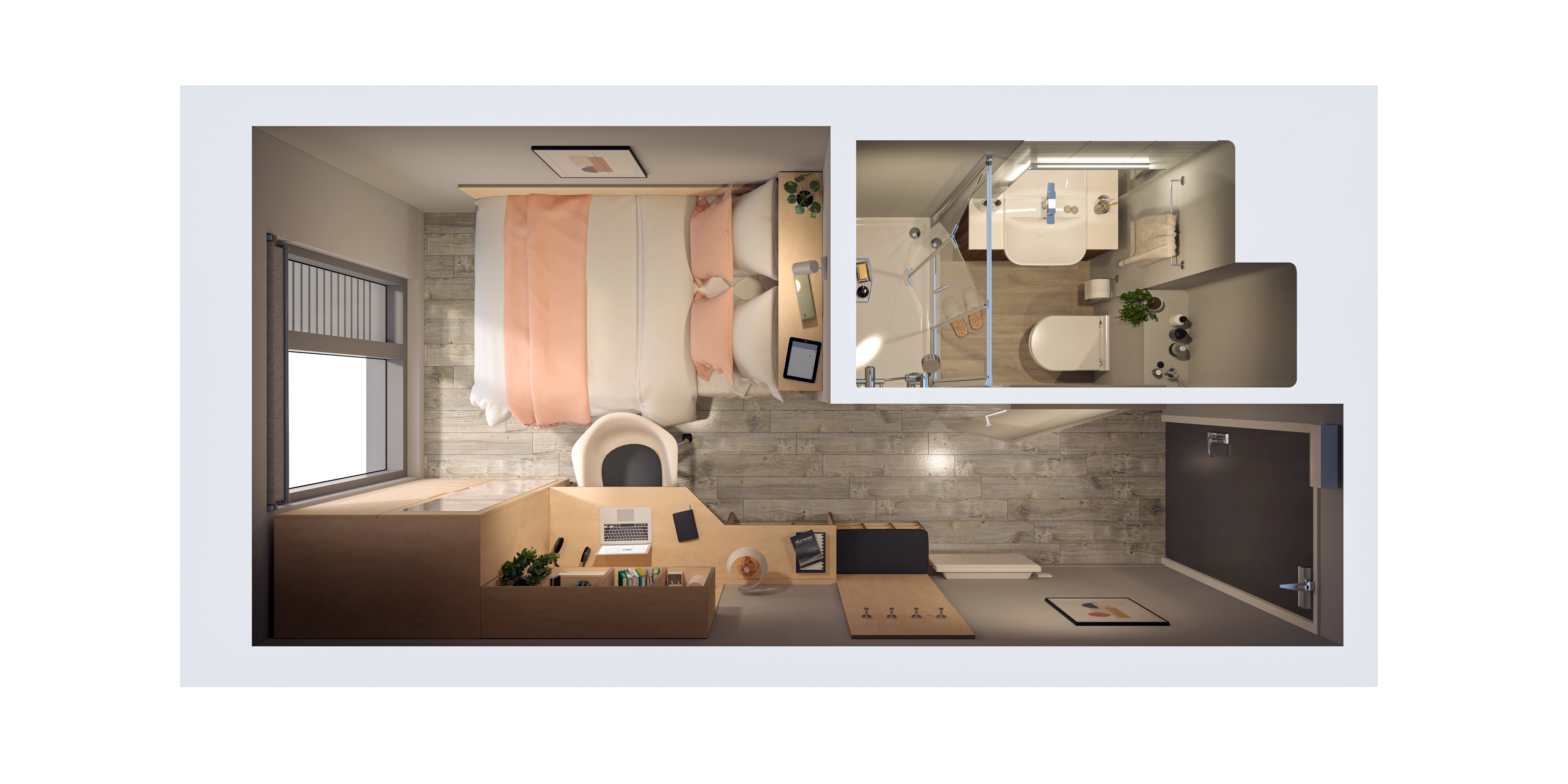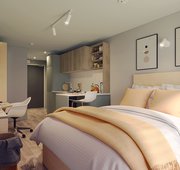 20.38 - 21.20 m² | Double bed, desk chair, wardrobe, bedside table, or additional shelving and under-bed storage En-suite with a Smart TV, desk area, fully fitted kitchen with an integrated washer-dryer, dishwasher, and breakfast bar area