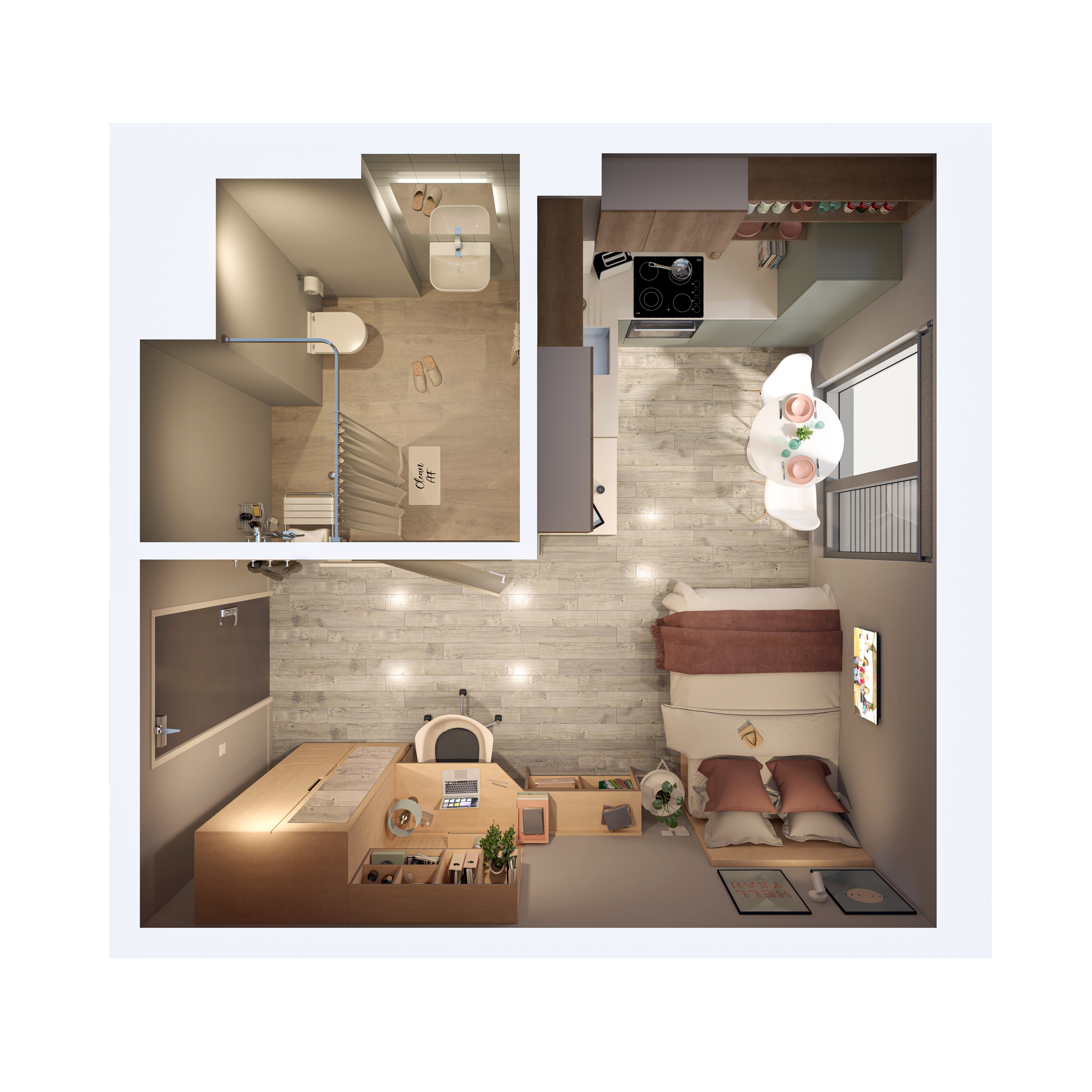 14.24 - 21.96 m² | Small double bed, desk chair, wardrobe, headboard shelving, and under-bed storage Shared living, kitchen, and dining area with a fully fitted kitchen, washing machine, tumble dryer, dishwasher, smart TV, sofa, and dining table with chairs