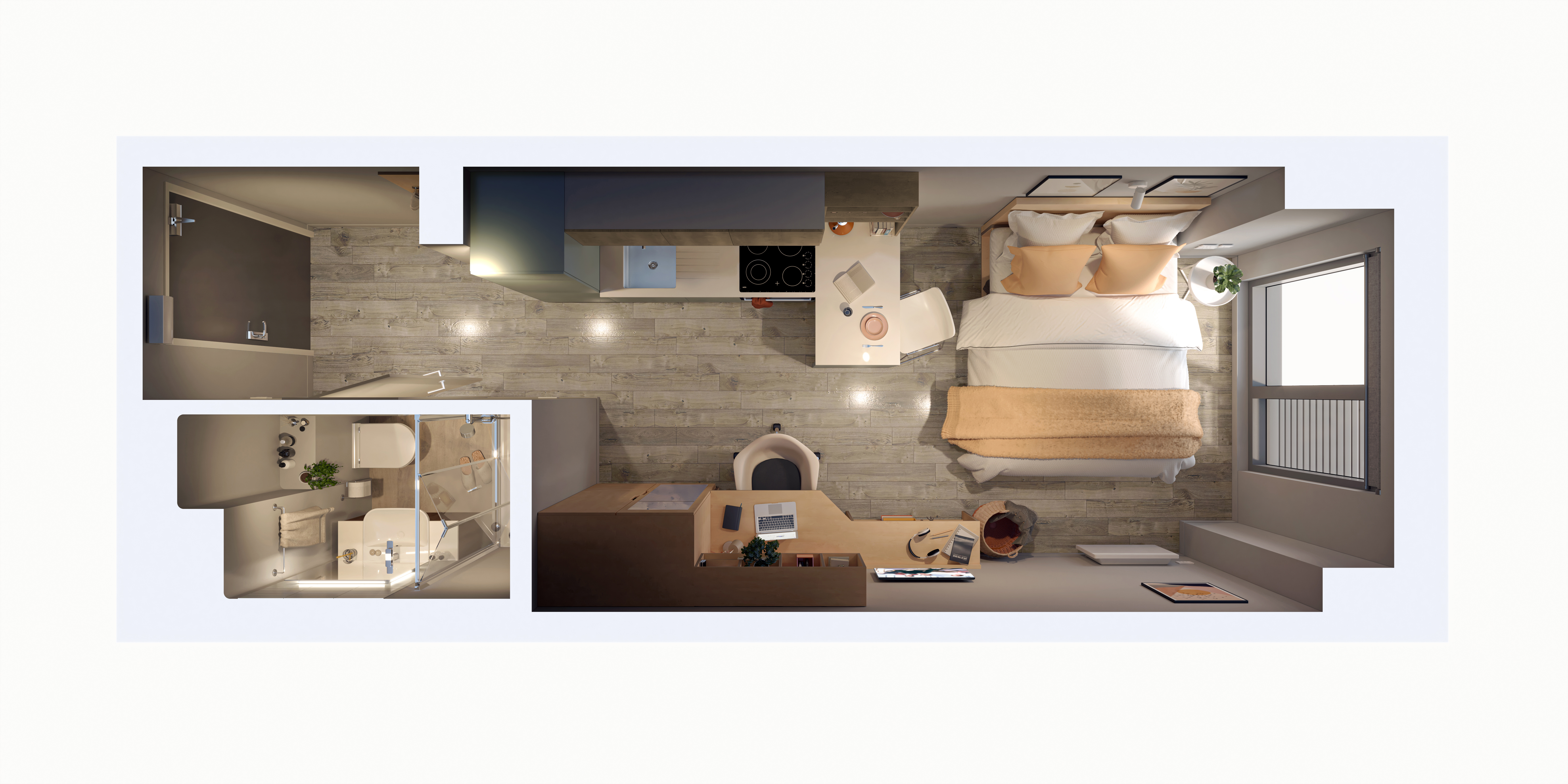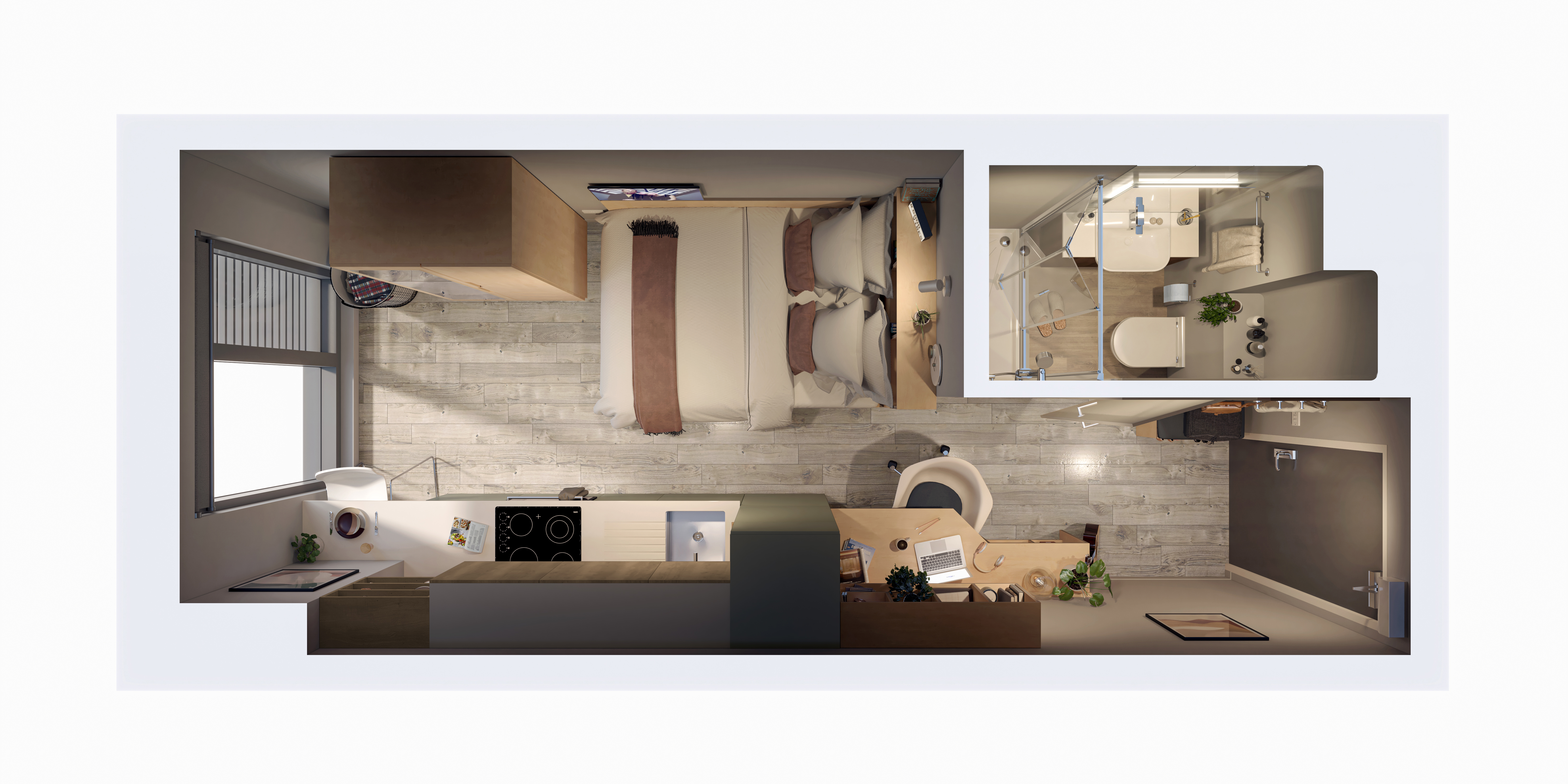 16.97 - 17.14 m² | Double bed, desk chair, wardrobe, headboard shelving, and under-bed storage En-suite with a Smart TV, desk area, and fully fitted kitchen with an integrated washer-dryer, dishwasher