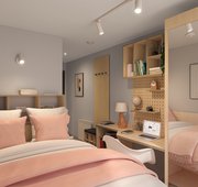 13.37 - 19.79 m² | Small double bed, desk chair, wardrobe, headboard shelving, and under-bed storage Shared living, kitchen, and dining area with a fully fitted kitchen, washing machine, tumble dryer, dishwasher, smart TV, sofa, and dining table with chairs