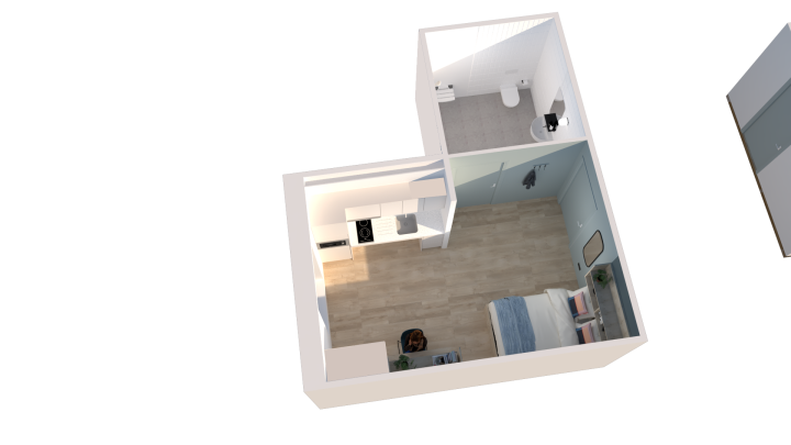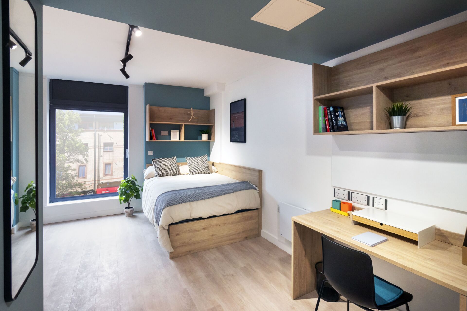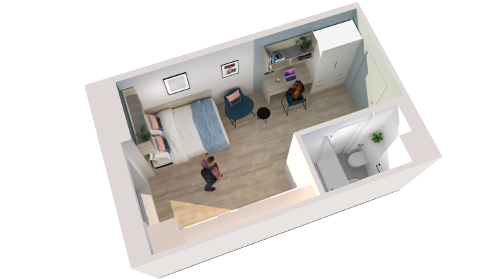 This is a modern single-occupancy Studio: Ground floor room with En-Suite bathroom Large 17m2 private room Room contains a double bed Fully furnished Studio to include wardrobe, shelving, study desk, with integrated magnetic whiteboard, study chair, USB ports, adjustable lighting by the bed, coat hook, mirror and additional built-in under bed storage Fully equipped private living room area and kitchenette