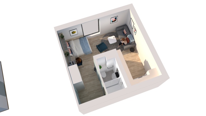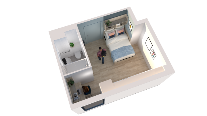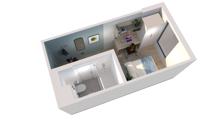 This is a modern single-occupancy Studio: Corner studio with floor to ceiling windows with En-Suite bathroom Extra large 27m2 private room Room contains a double bed Fully furnished Studio to include wardrobe, shelving, study desk, with integrated magnetic whiteboard, study chair, USB ports, adjustable lighting by the bed, coat hook, mirror and additional built-in under bed storage Fully equipped private living room area and kitchenette