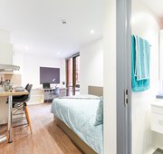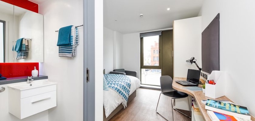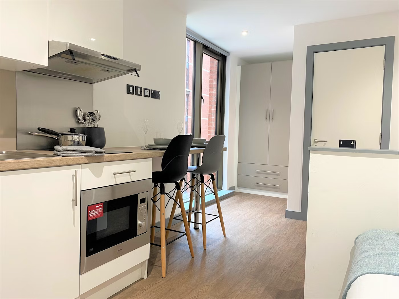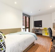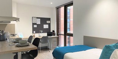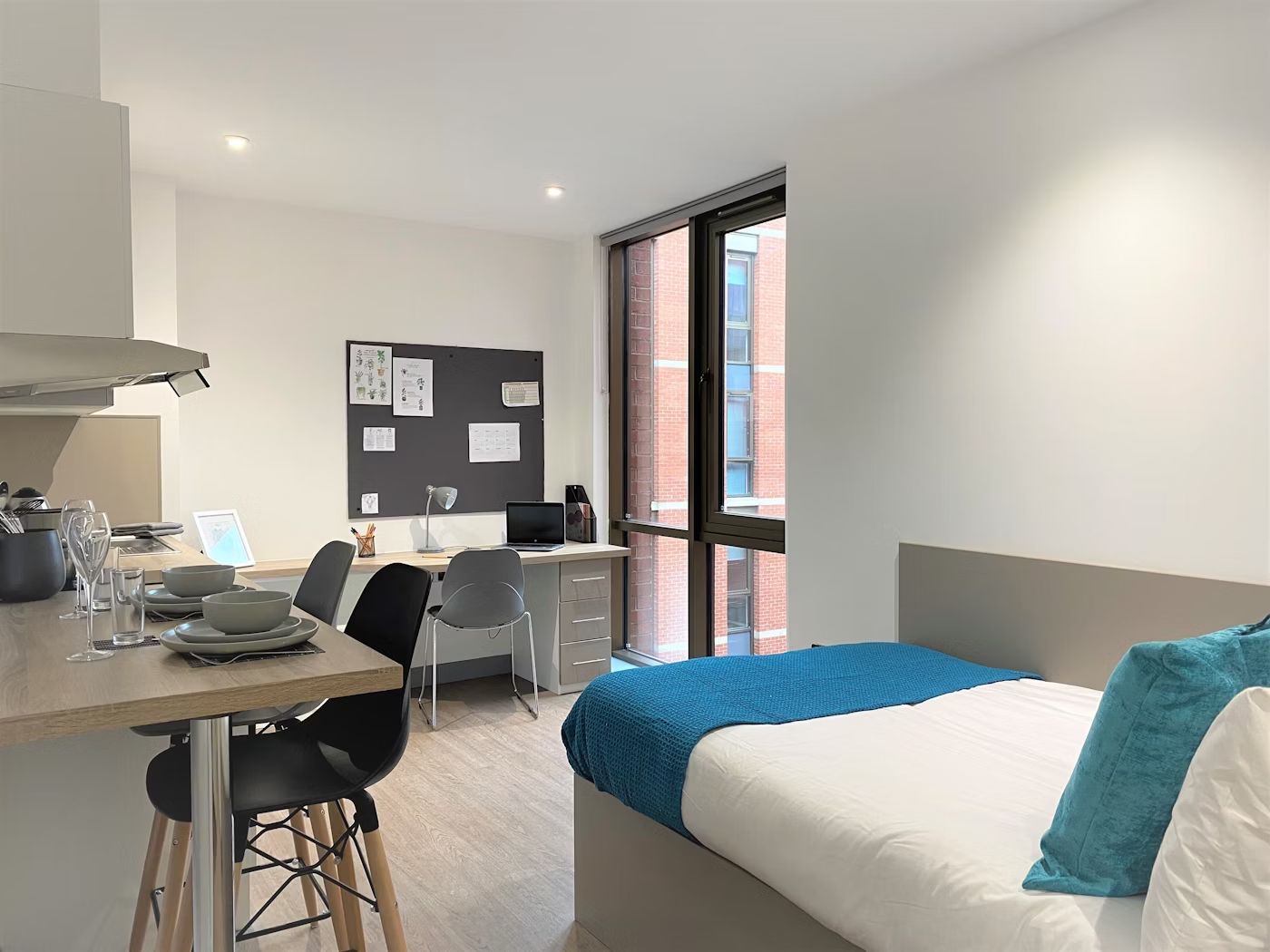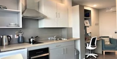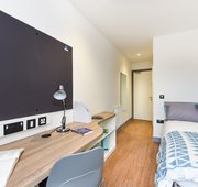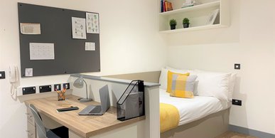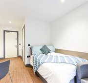 Self-contained kitchen, bathroom and living space plus easy access to lifts. Approximately 20.4- 22.5m² Small double bed Accessible ready ensuite shower room Underbed storage, desk, chair, wardrobe and full-length mirror included in the room.