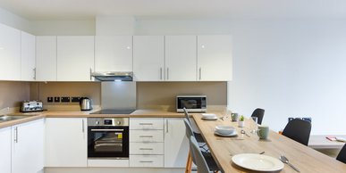 Communal kitchen and living space with up to 6 en-suite rooms per flat Approximately 14.8-15.2m² Small double bed Underbed storage, desk, chair, wardrobe and full-length mirror included in the room