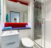 Communal kitchen and living space with up to 6 en-suite rooms per flat. South facing on floors 1-6 Approximately 15-18m² Small double bed Underbed storage, desk, chair, wardrobe and full-length mirror included in the room
