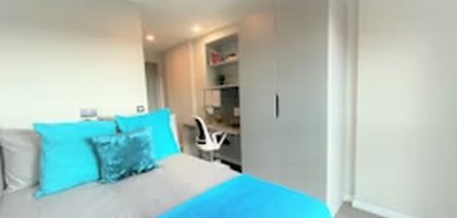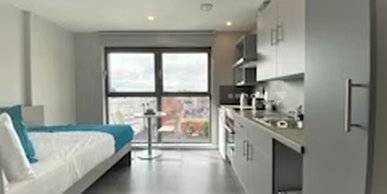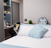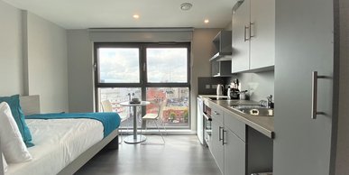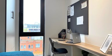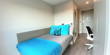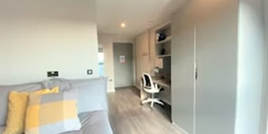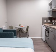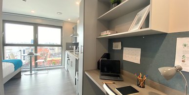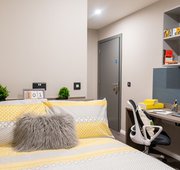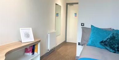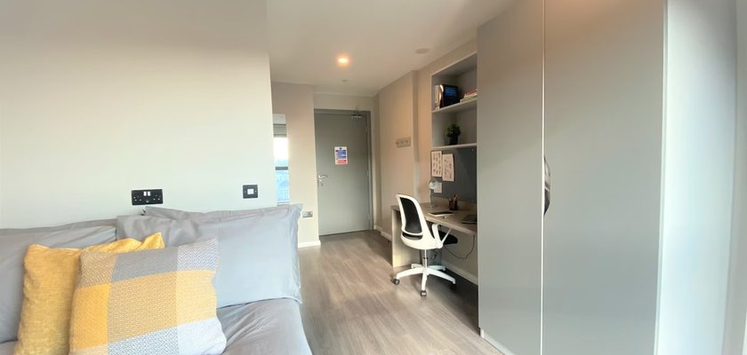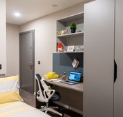 Self-contained kitchen, bathroom and living space, plus easy access to lifts Double bed Approximately 20.4 - 22.5m² Underbed storage, desk, chair, wardrobe and full-length mirror included in the room Accessible ready en-suite shower room