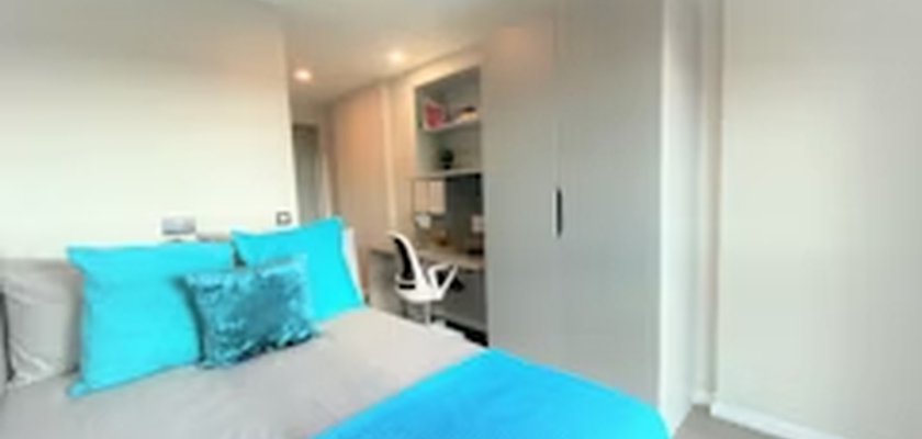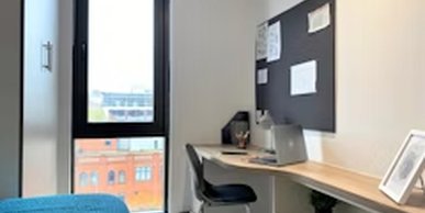 Communal kitchen and living space with up to 7 en-suite rooms per flat. South facing rooms on floor 6-8 overlooking St Anne's Cathedral and Ulster Uni Small double Underbed storage, desk, chair, wardrobe and full-length mirror included in the room Approximately 13.5m²