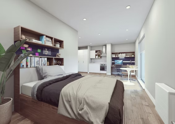 Communal kitchen and living space with up to 4-7 en-suite rooms per flat Located on the external facades of the property, higher floor with views across Belfast 14.7m² Small double bed En-suite toilet and shower facilities Desk and storage space