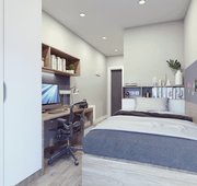 Communal kitchen and living space with up to 4-7 en-suite rooms per flat Located on the external facades of the property, higher floor with views across Belfast 13.5m² Small double bed En-suite toilet and shower facilities Desk and storage space