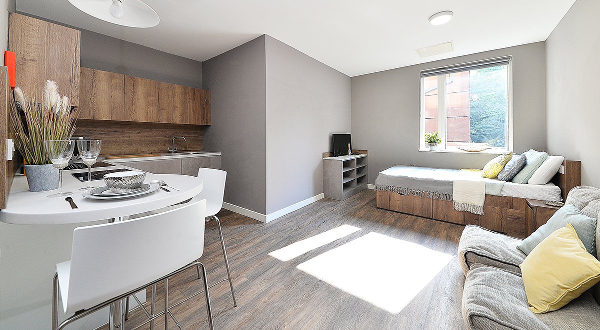 Combining privacy with independence, our standout studio apartments come complete with en suite bathroom facilities, fully equipped kitchens, and spacious desk areas. Study rooms, a communal living area and a private gym for residents’ use create a fantastic communal atmosphere, while individual studios offer peace and privacy. It’s the perfect blend for those who want a mix of luxury and comfort.