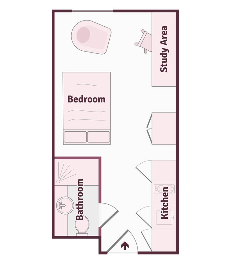 This luxury and modern studio measures around 18.3m2 and comes with a double bed, study area, fully fitted kitchenette, ensuite bathroom and ample storage. The shared areas include study rooms and a snug. You will also enjoy access to the onsite gym, cinema room and games room.