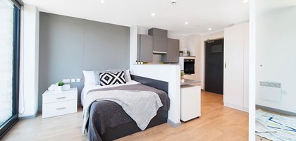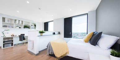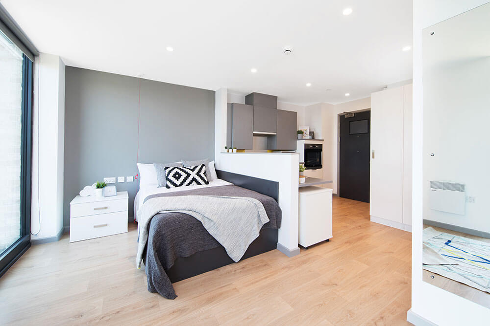 The Premium Ensuite offers a fully furnished room with a 3-4th bed, study desk, under-bed storage, wardrobe, and bedside table. It includes a noticeboard, full-length mirror, and curtains. The ensuite bathroom features a shower, toilet, washbasin, towel rail, and toilet roll holder, along with a mop, bucket, and dustpan. The shared kitchen provides a space for cooking and socializing. Perfect for students seeking comfort and convenience.