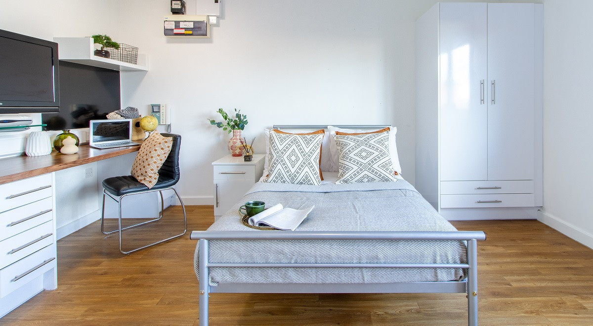 This studio comes with a ¾ sized bed, study area, ensuite bathroom, fully fitted kitchenette and ample storage. You will also have access to the onsite laundry facilities, common room and onsite gym. Please note: Our beds are small doubles BUT require double bedding.